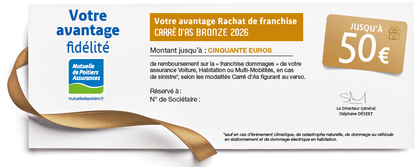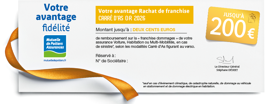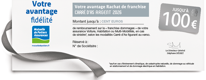 (1) Avantage valable en 2026 et acquis en fonction de la situation Carré d'As du sociétaire à la date du sinistre, sauf pour les sociétaires ayant déjà utilisé un rachat de franchise au cours des 36 mois précédant le sinistre. Il est utilisable en une seule fois (avantage non scindable).